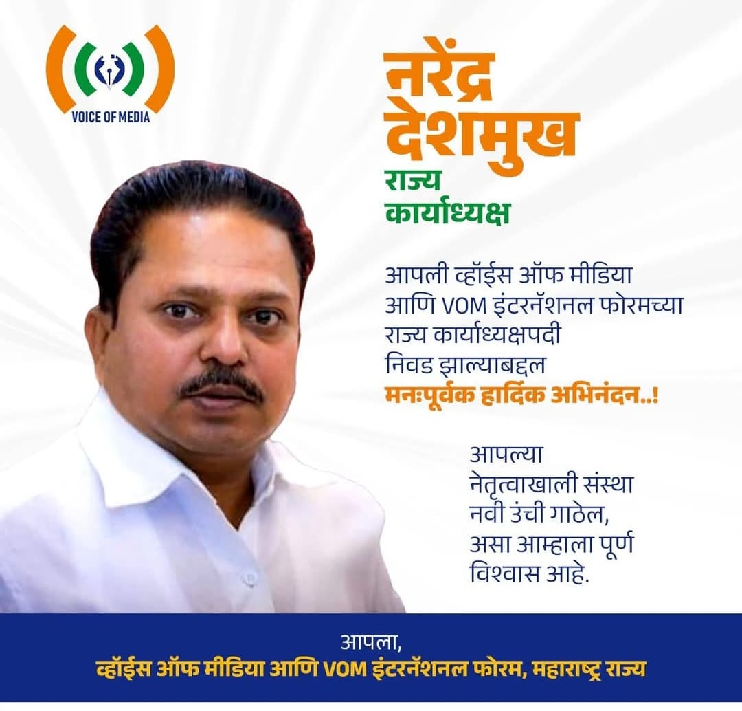त्यांच्या या उल्लेखनीय निवडीबद्दल आणि महाराष्ट्र प्रदेश कार्याध्यक्ष या उच्च जबाबदारीच्या पदासाठी झालेल्या नियुक्तीबद्दल मी मनःपूर्वक अभिनंदन करतो. पुढील काळातही त्यांनी पत्रकारिता, विमा सल्लागार सेवा आणि सामाजिक क्षेत्रात आणखी मोठे यश मिळवावे, Voice of Media या संघटनेत प्रगतीची नवी शिखरे गाठावीत, हीच ईश्वरचरणी प्रार्थना.